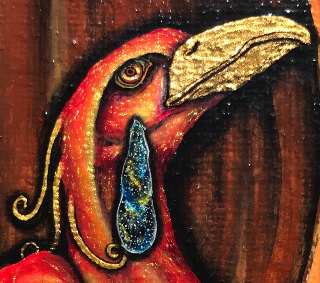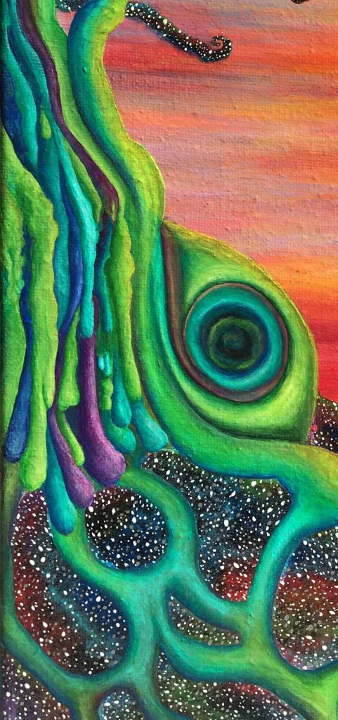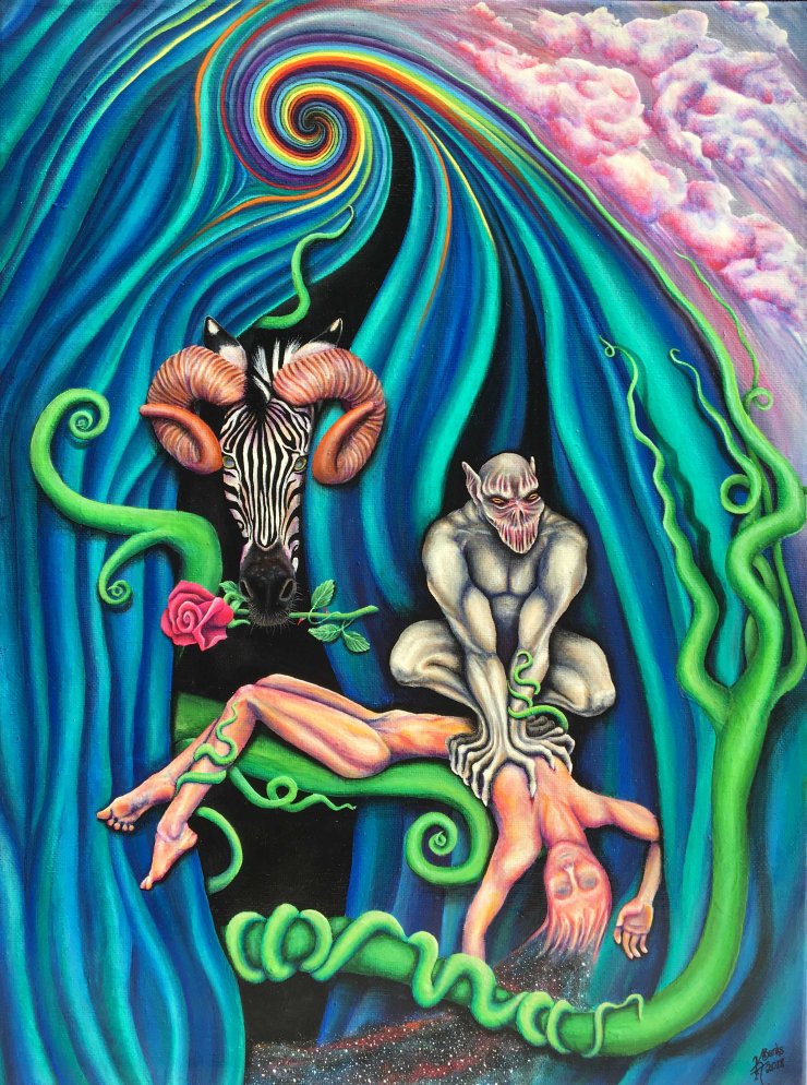 Master Work ~Revival ~ 12″ x 16″ Acrylic, Metallic Acrylic, and Archival Varnish on Back Stapled Canvas, 2018. Inspired by, Henri Fuseli’s, Nightmare, 1781