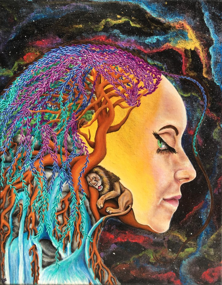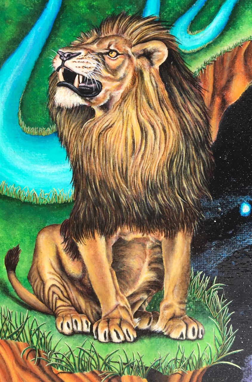 The lion, so comfortable sleeping upon the roots of the Tree of Life, is unaware of his own strength and wisdom. Waking the lion up reveals that the power to heal, grow and transform is always within.