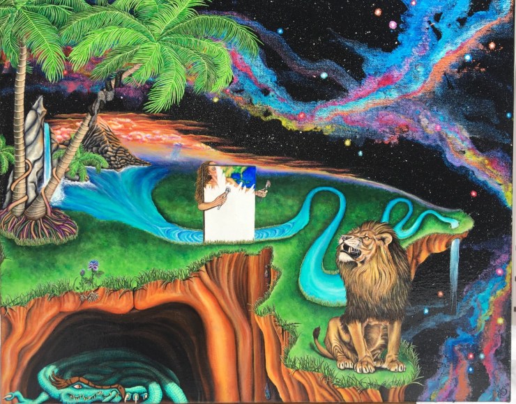 Master Work ~ Limitless Life ~ 16” x 20” Acrylic, Metallic Acrylic, Color Shifting Acrylic, Metal Leaf Flakes, and Archival Varnish on Belgian Linen, March 2019. (First piece in Diptych ~Together We are One~ created to be placed above)