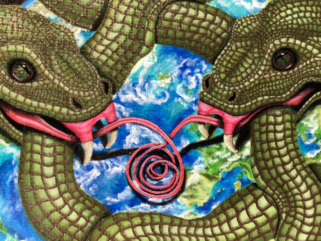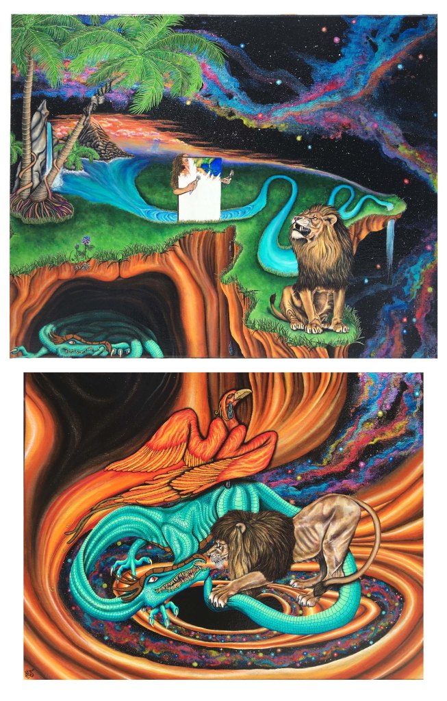 The lion gently but sternly takes the tail out of the dragon’s mouth, breaking the cycle and transforming creation. In doing so, it wakes up the phoenix. Out from the dark cave depths the dragon is now displayed under the fiery wing of the phoenix, and powerful change takes place. Into the black hole, EVERYTHING GOES, except for the phoenix who rises above to create anew.