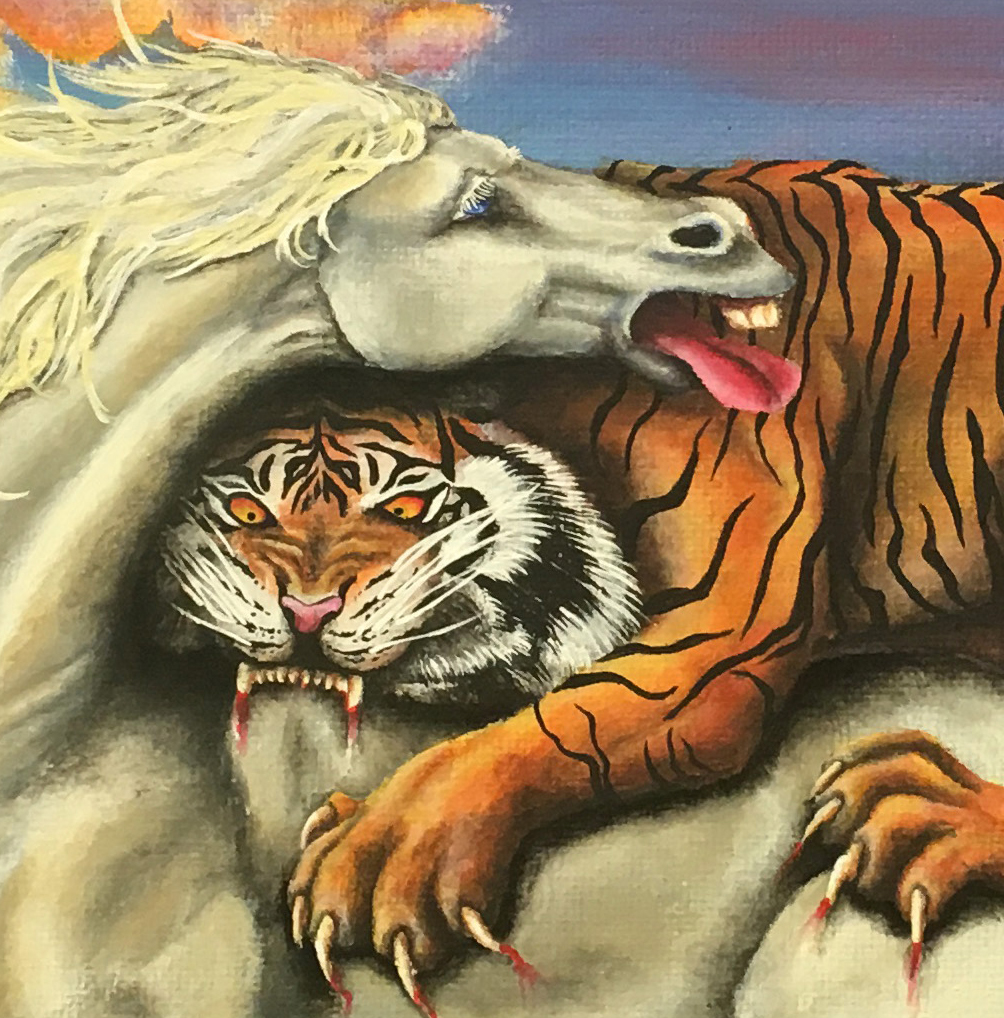 Master Work ~ Balance ~ 12″ x 16″ Acrylic on Back Stapled Canvas, 2017. Inspired by, George Stubb’s, Horse Devoured by a lion, 1765